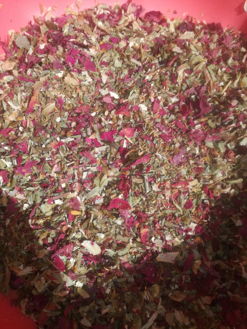 I. komló, levendula, galagonya virágos ágvég, citromfű, rózsa szirom, szurokfű, tárkony, napraforgó szirom
